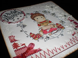 Yesterday I hopped along a great xmas blog hop at Karen's Doodles. This card is made for the challenge that comes with it to use a Karen's Doodles xmas digi. So today I made this Xmas card using Karen's Doodles digi Baby Jesus and I colored it with som promarkers. The star and his shine are traced with some gold glitter glue. Love the effect it gives. Behind the digi I adhered a yellow doily. The dp is cut smaller than the white linen cardbase and I distressed the edges of all items. Also used a star die, a sentiment, some strass and a edge punch.